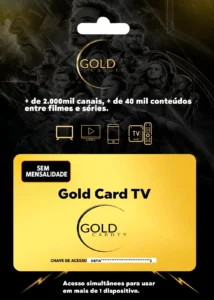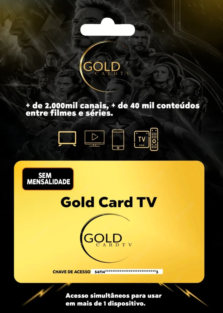 O GoldCard é compatível com uma ampla gama de dispositivos, incluindo Smart TVs (Samsung, LG, Android TV), TV Box, Smartphones (Android e iOS), Computadores e Tablets. O acesso é feito através de aplicativos oficiais recomendados após a compra.